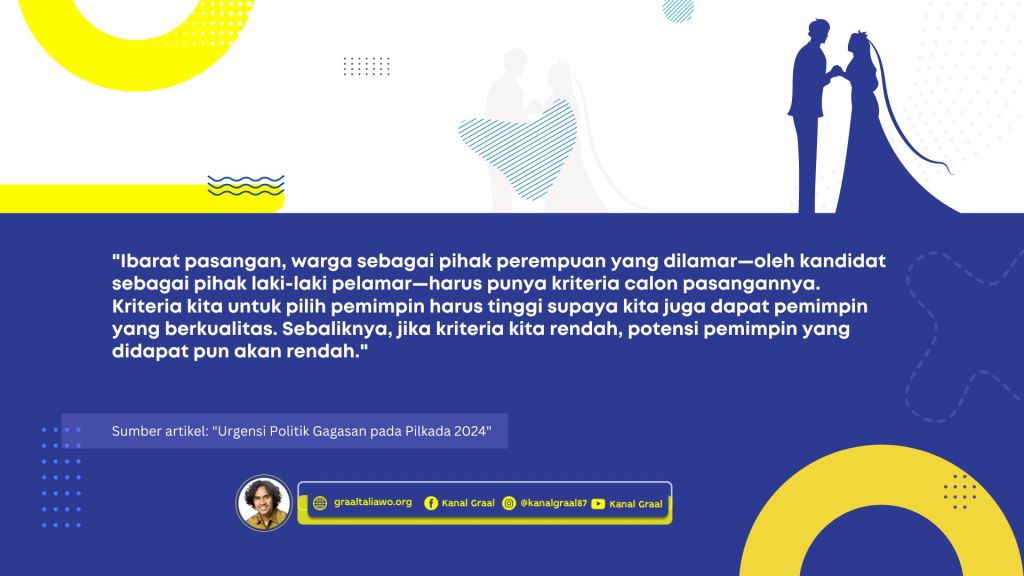 Ibarat pasangan, warga sebagai pihak perempuan yang dilamar—oleh kandidat sebagai pihak laki-laki pelamar—harus punya kriteria calon pasangannya. Kriteria kita untuk pilih pemimpin harus tinggi supaya kita juga dapat pemimpin yang berkualitas. Sebaliknya, jika kriteria kita rendah, potensi pemimpin yang didapat pun akan rendah.