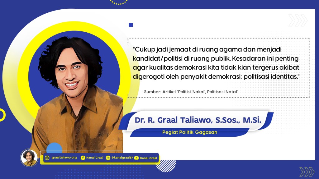 Sebagai manusia yang beriman, etika adalah penting sebagai ciri manusia beradab. Kembalikan Natal pada kesakralannya dan kembalikan demokrasi (salah satunya kampanye) pada esensinya. Cukup jadi jemaat di ruang agama dan menjadi kandidat/politisi di ruang publik. Kesadaran ini penting agar kualitas demokrasi kita tidak kian tergerus akibat digerogoti oleh penyakit demokrasi: politisasi identitas.